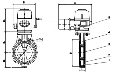 部件列表:1、阀体 2、阀座 3、蝶板 4、阀杆 5、气动装置